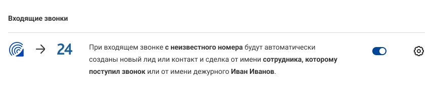 1. Чтобы при новом входящем или исходящем звонке в Битрикс24 автоматически создавался лид или сделка с контактом, нужно включить создание этих сущностей в АТС.