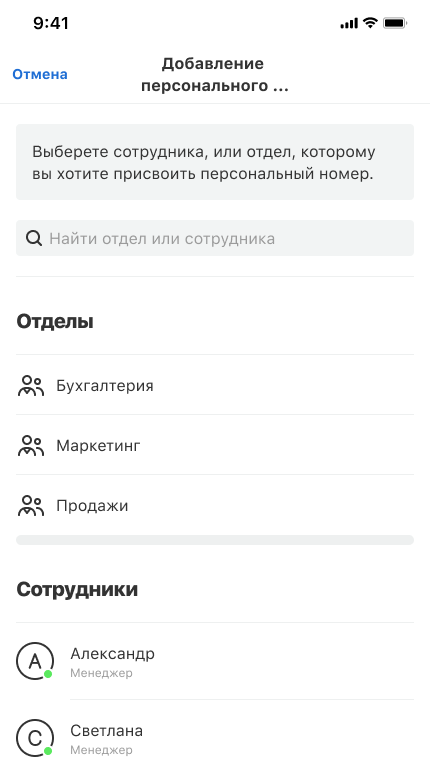 Далее укажите сотрудника или отдел, который будет принимать прямые звонки менеджеру.