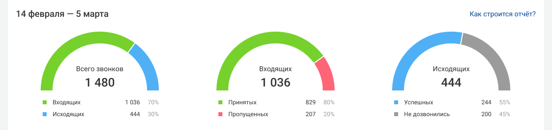 • сколько всего звонков состоялось — число и доля входящих и исходящих в отделе за выбранный период, какими звонками отдел больше загружен;