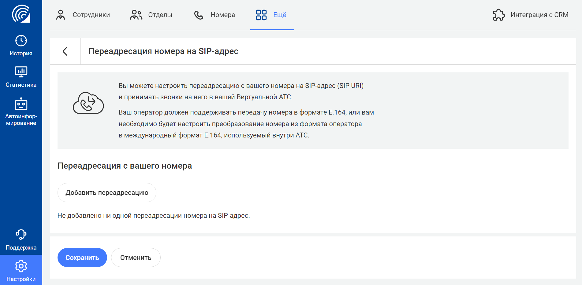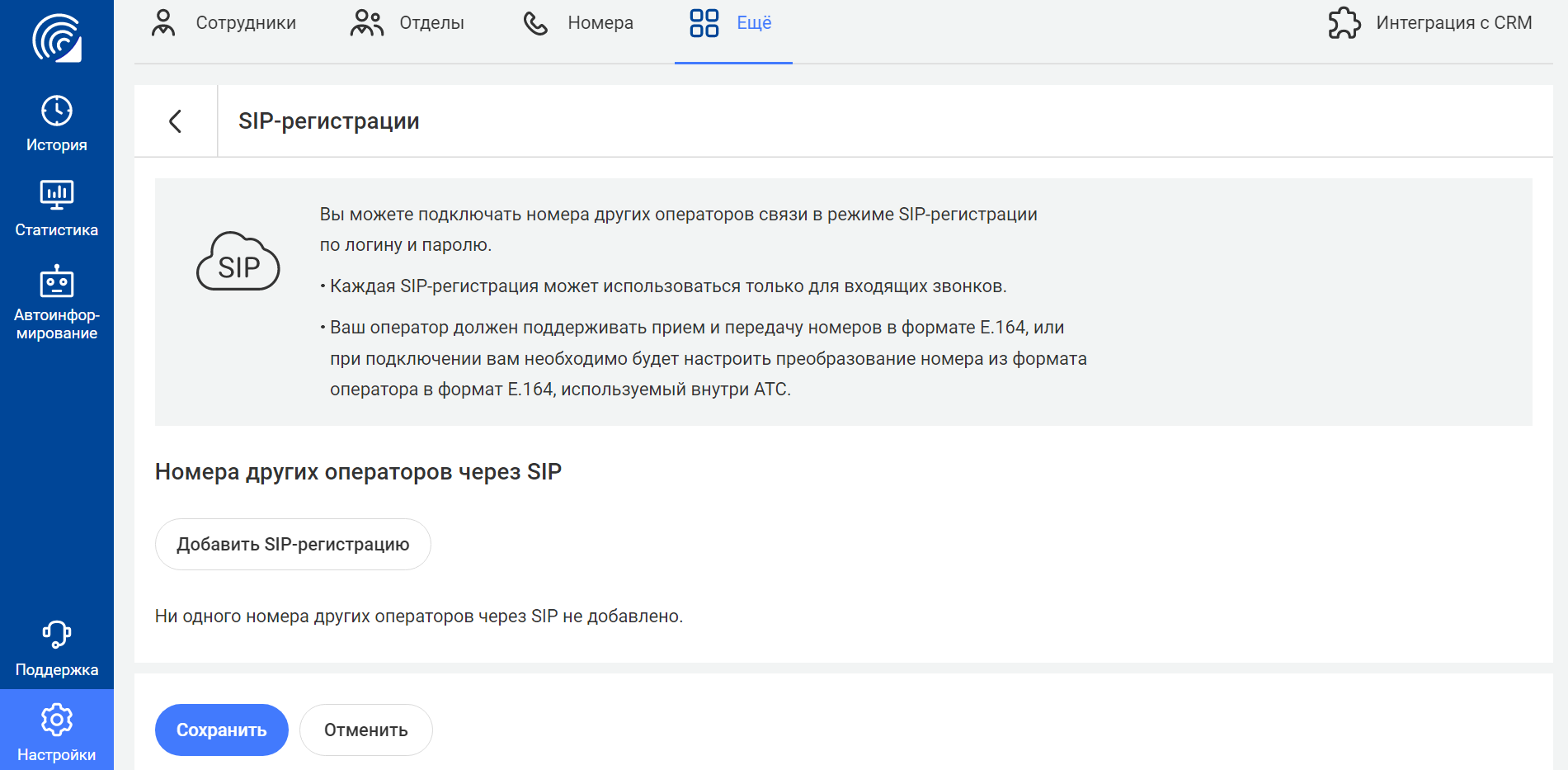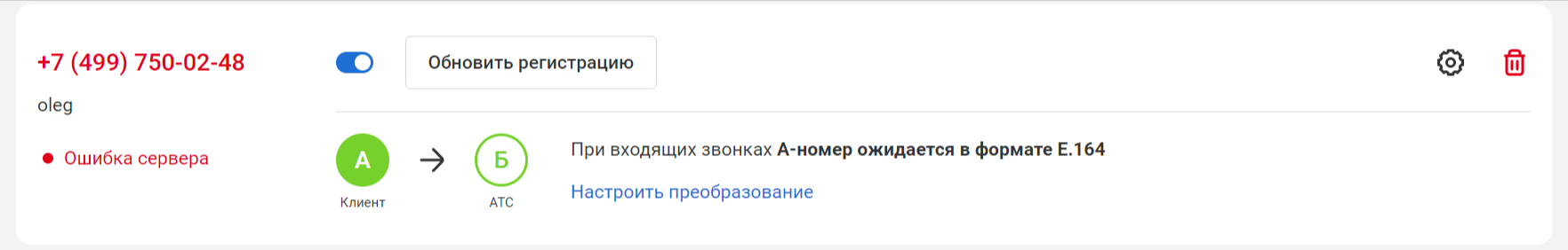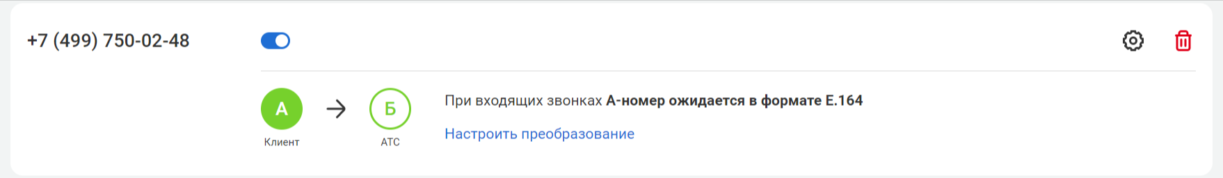 Также в настройках номера будет раздел «При входящих звонках А-номер ожидается в формате E.164». Это техническая информация и, чаще всего, сюда вносить изменения не требуется. Если ваш оператор связи работает не по стандарту E.164, здесь вы сможете настроить преобразование.